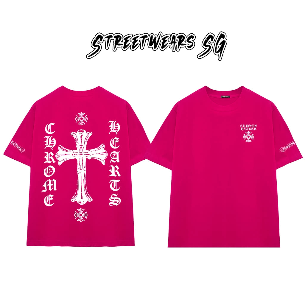 - Thiết kế: Mặt trước in logo Chrome Hearts cùng biểu tượng bông hoa gothic ở ngực trái đầy tinh tế. Mặt sau nổi bật với họa tiết thánh giá lớn, hai bên là dòng chữ "CHROME HEARTS" theo phong cách chữ cổ Gothic, tạo điểm nhấn đậm chất streetwear cao cấp.