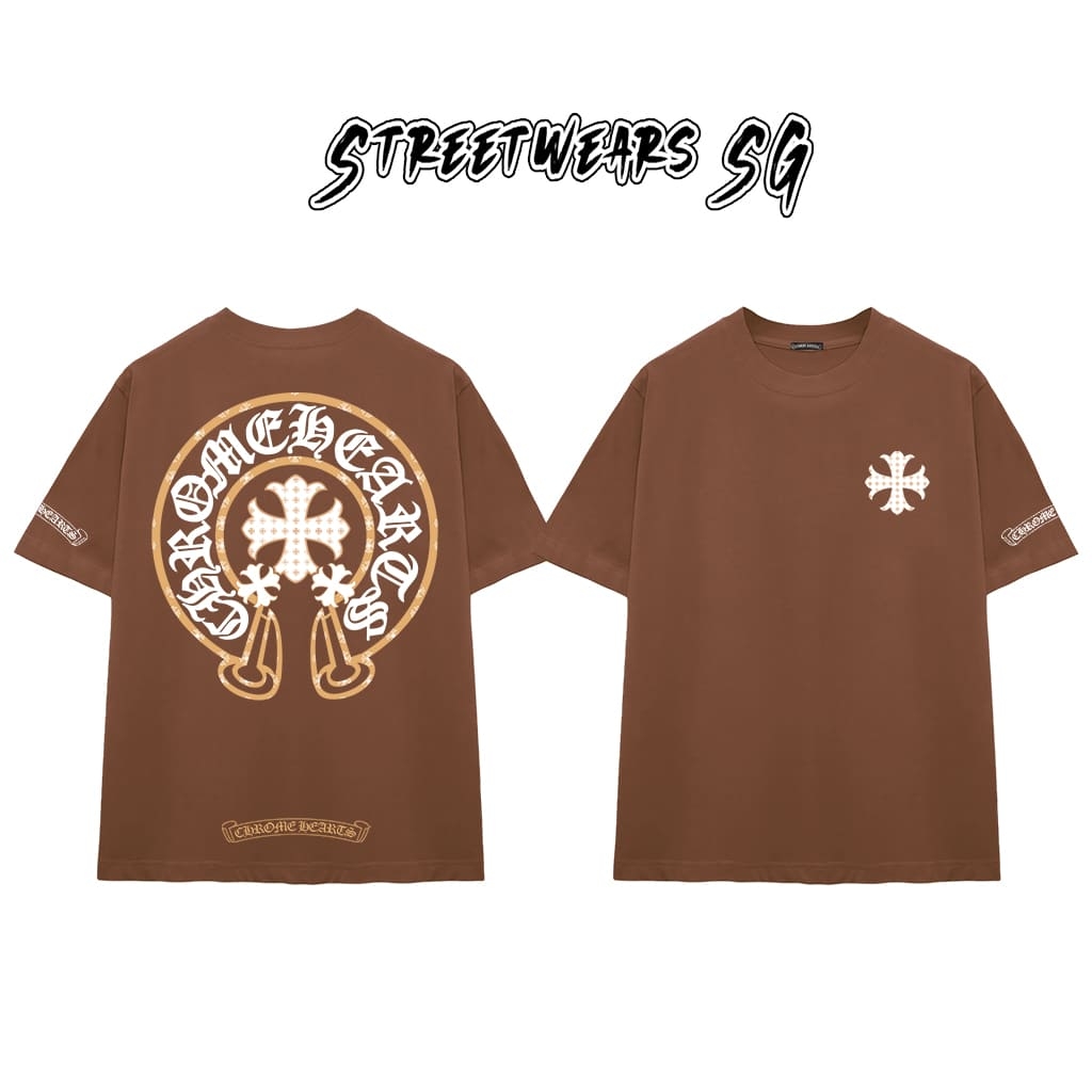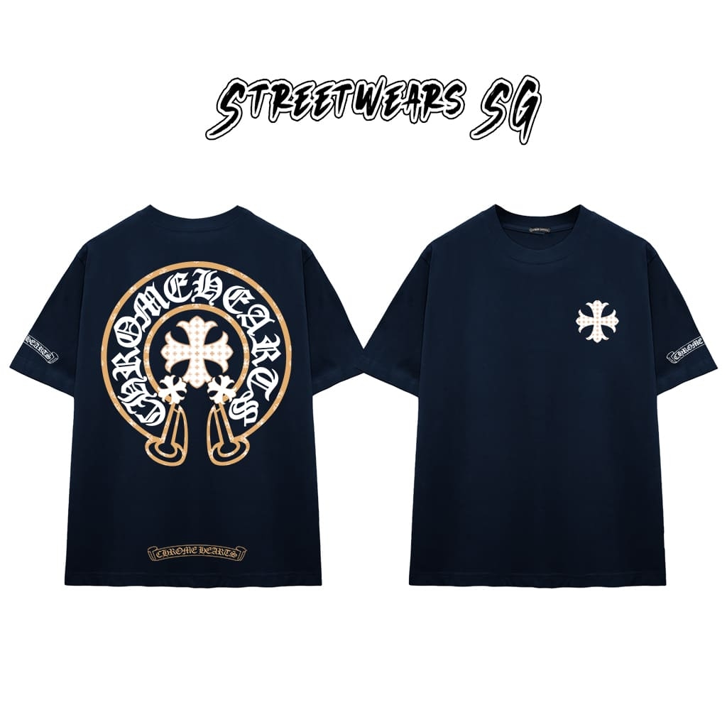 - Thiết kế: Mặt trước in biểu tượng thánh giá Chrome đơn giản nhưng nổi bật. Mặt sau tạo điểm nhấn với hoạ tiết hình tròn lớn chứa chữ "CHROME HEARTS" bao quanh thánh giá đôi, kèm theo viền vàng ánh kim nổi bật giúp tổng thể thêm phần cao cấp và sang trọng. Tay áo và gấu áo in logo phụ tinh tế, đậm chất streetwear.