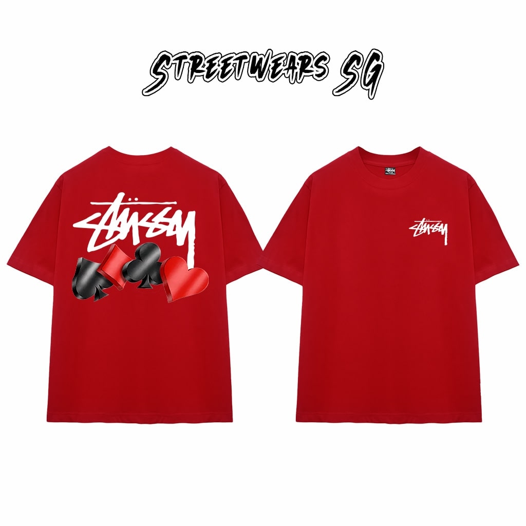 - Thiết kế: Mặt trước in logo Stu nhỏ gọn tinh tế. Mặt sau nổi bật với bộ họa tiết lá bài (cơ, rô, tép, bích) phối màu đỏ – đen hiện đại, kết hợp cùng logo Stu lớn, tạo điểm nhấn cá tính, độc đáo và đậm chất streetwear.