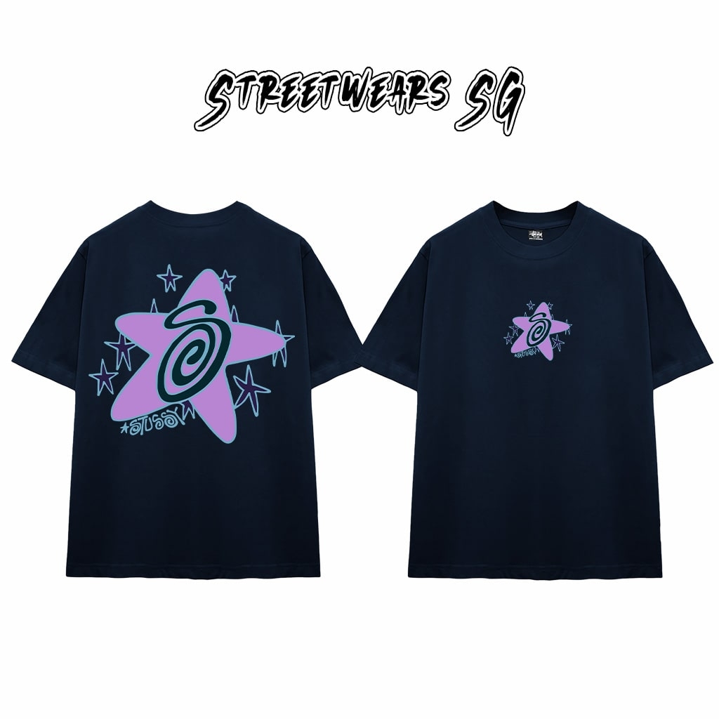 - Thiết kế: Mặt trước in hình ngôi sao tím kết hợp xoáy tròn logo Stu nổi bật, xung quanh là họa tiết ngôi sao nhỏ tạo điểm nhấn độc đáo. Mặt sau nổi bật với họa tiết ngôi sao lớn phối màu tím – xanh độc đáo, mang phong cách hiện đại và đậm chất streetwear.